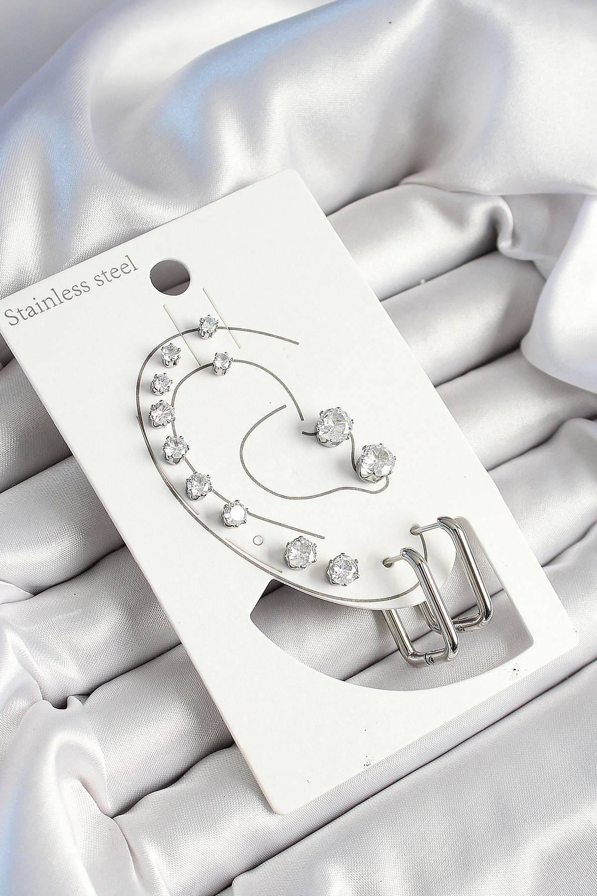 316l Çelik Dikdörtgen Figürlü Ve Zirkon Taşlı Gümüş Renk 7'li Çift Kadın Küpe Set