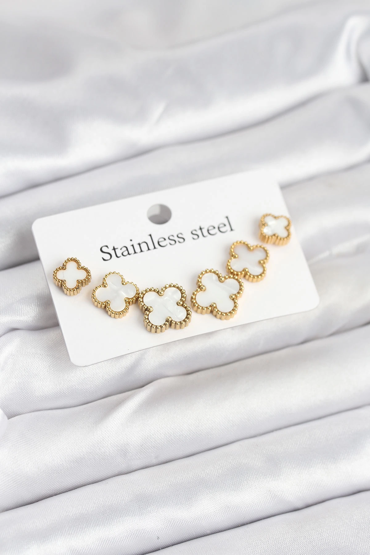 316l Çelik Gold Beyaz Renk 3 Boy Yonca Küpe Seti