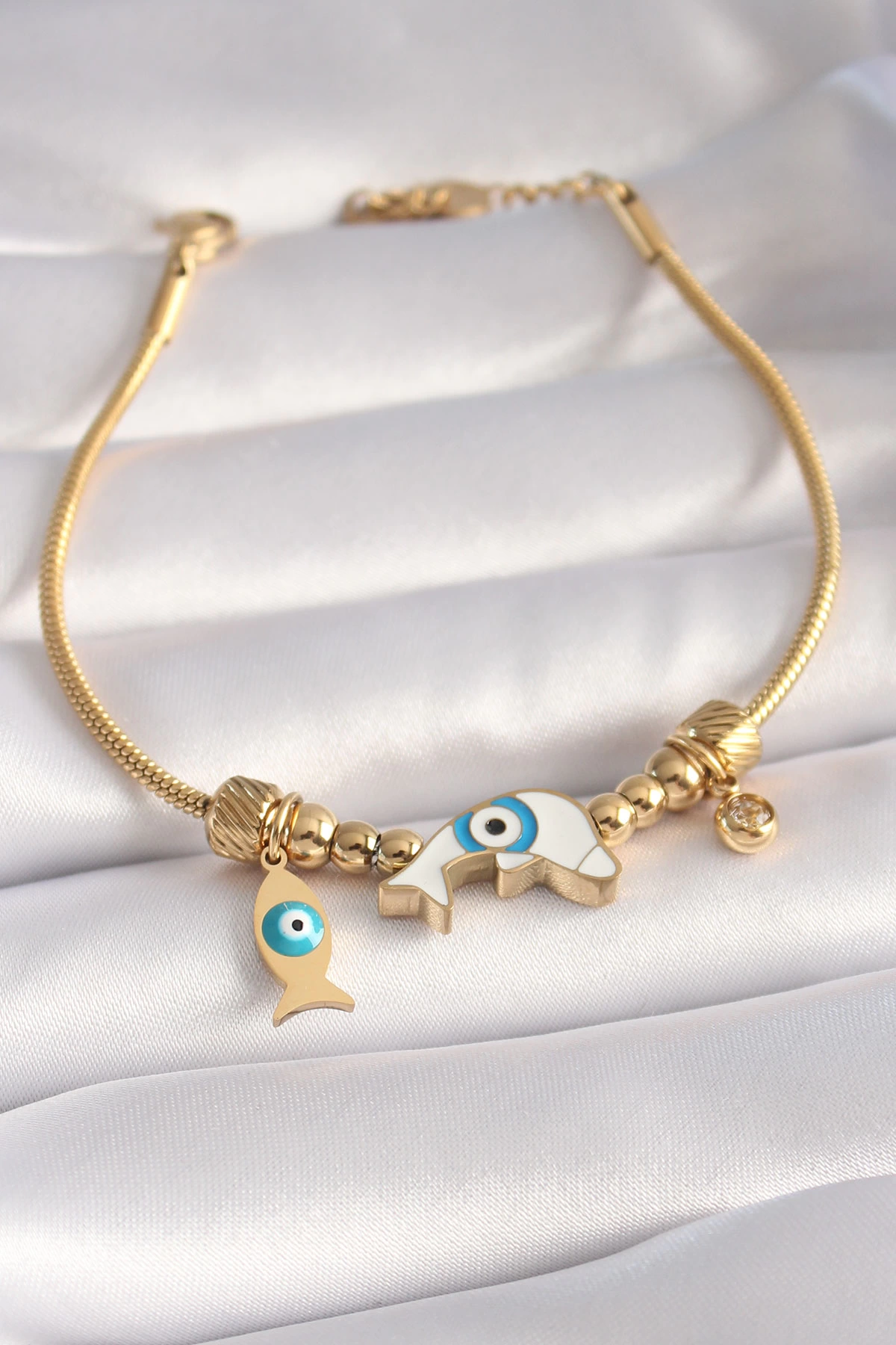 316l Çelik Gold Renk Balık Figür Nazar Boncuk İşleme Kadın Bileklik