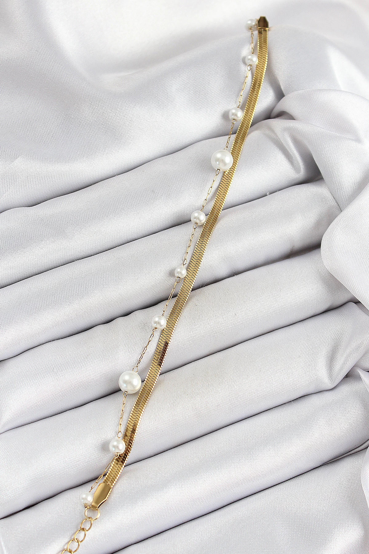 316l Çelik Gold Renk İncili Ve İtalyan Zincirli Kadın Bileklik