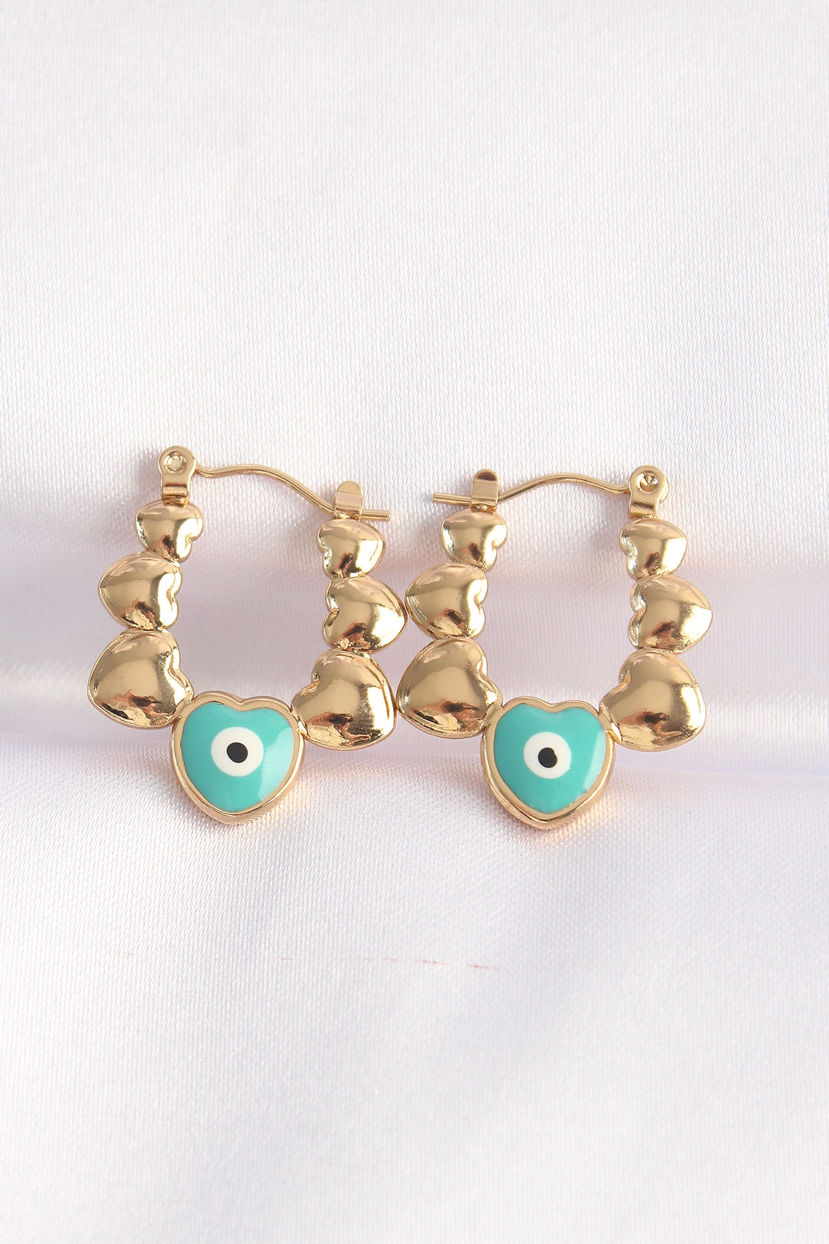 316l Çelik Gold Renk Mavi Nazarlı Kalpli Model Küpe