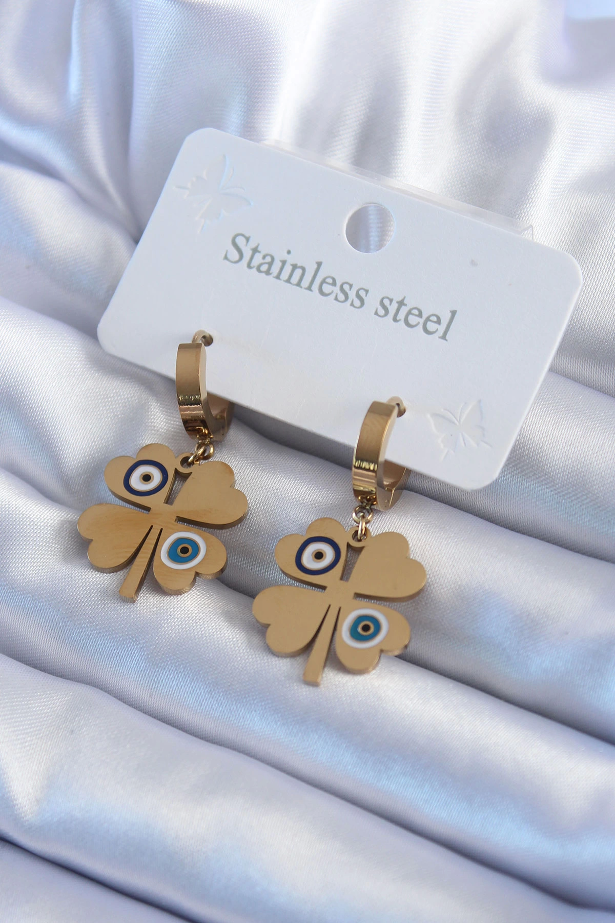 316l Çelik Gold Renk Yonca Model Nazar Boncuk Detay Kadın Küpe