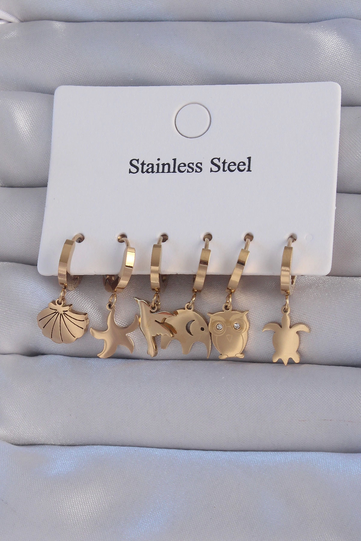 316l Çelik Gold Renk Zirkon Taşlı Hayvan Figürlü Deniz Yıldızı Model Halka Küpe Seti