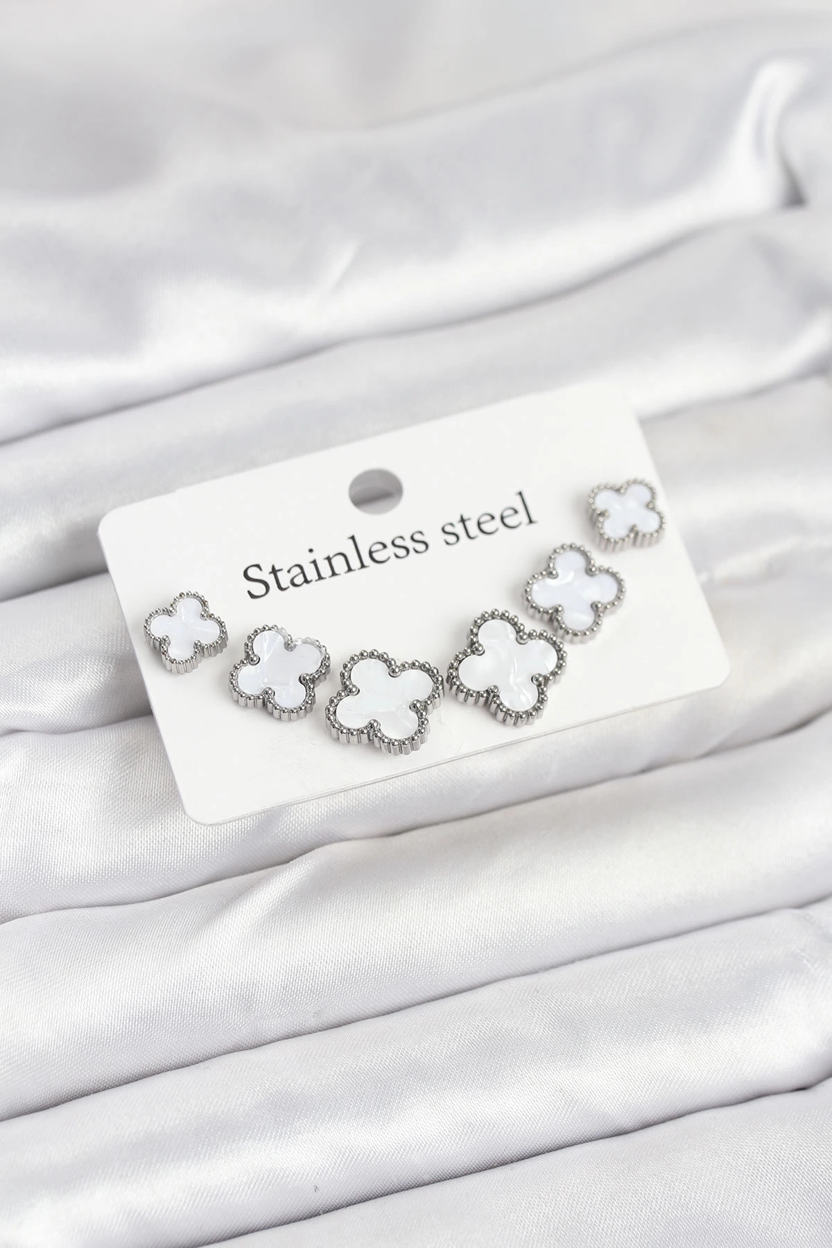 316l Çelik Gümüş Beyaz Renk 3 Boy Yonca Küpe Seti