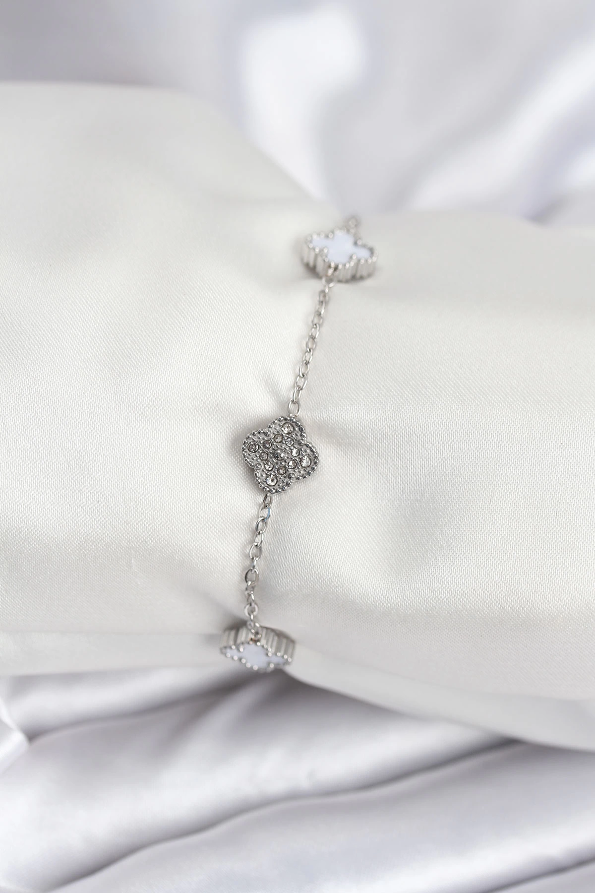 316l Çelik Gümüş Renk Beyaz Ve Zirkon Taşlı Baby Boy Yonca Kadın Bileklik