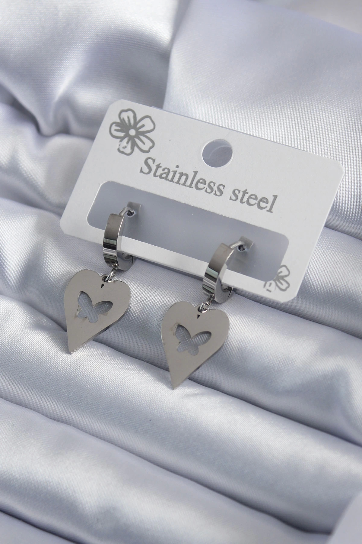 316l Çelik Gümüş Renk Kalp Model Kelebek İşleme Kadın Küpe