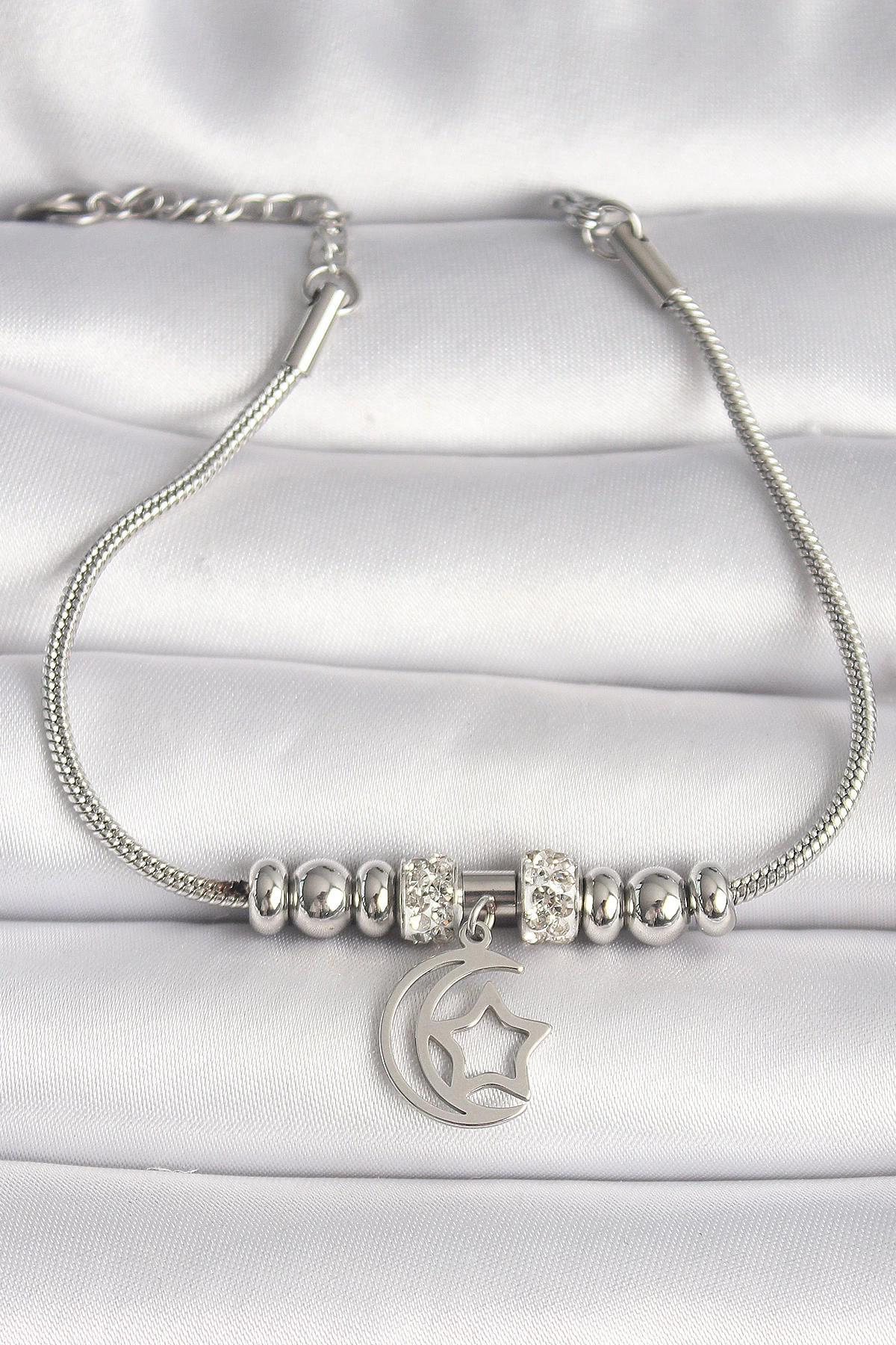 316l Çelik Gümüş Renk Tüp Zincir Zirkon Taş Detaylı Sallantı Ay Yıldız Figür Kadın Bileklik