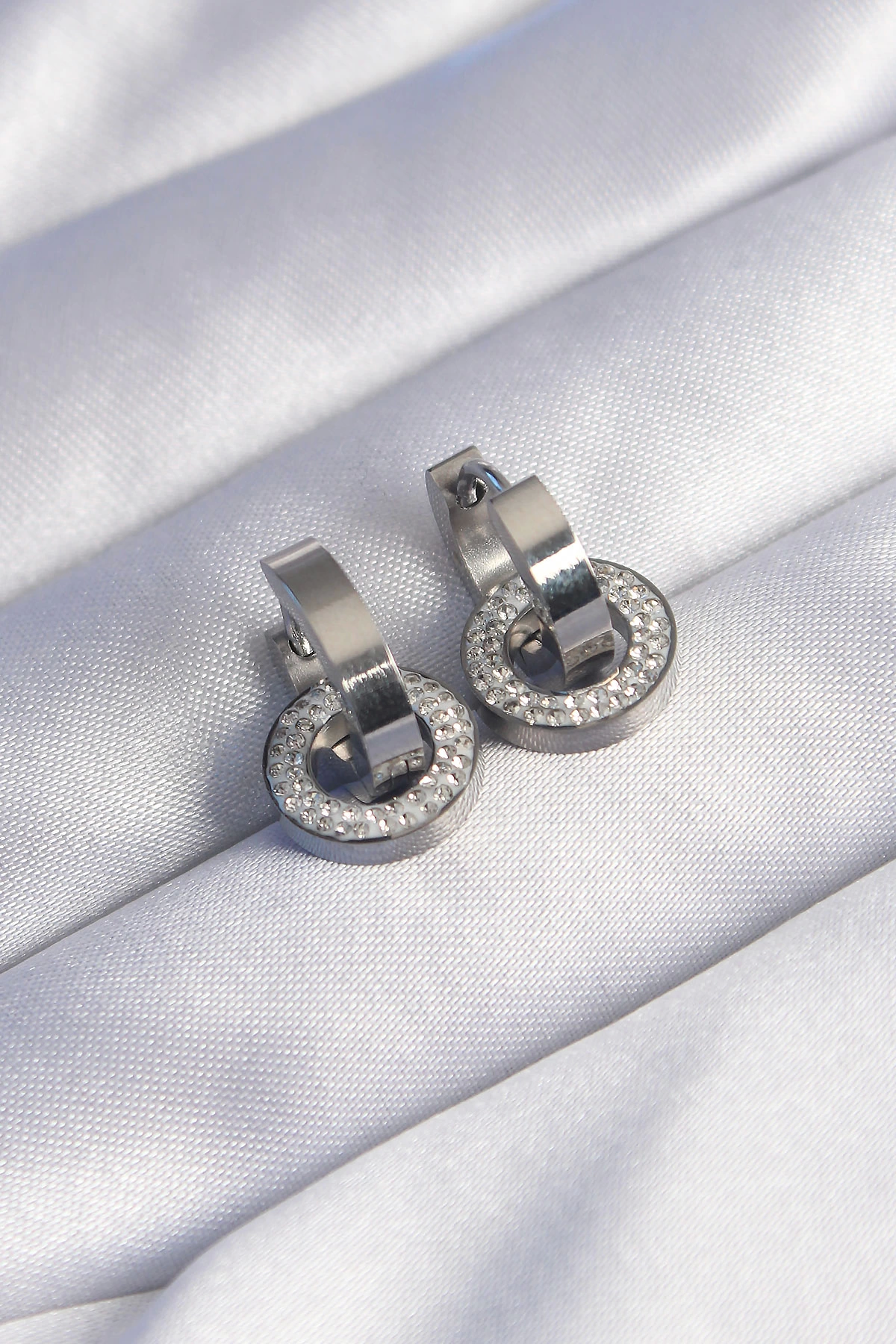 316l Çelik Gümüş Renk Zirkon Taşlı İç İçe Geçmeli Oval Küpe