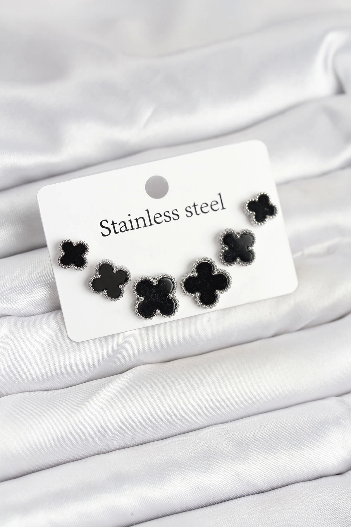 316l Çelik Gümüş Siyah Renk 3 Boy Yonca Küpe Seti