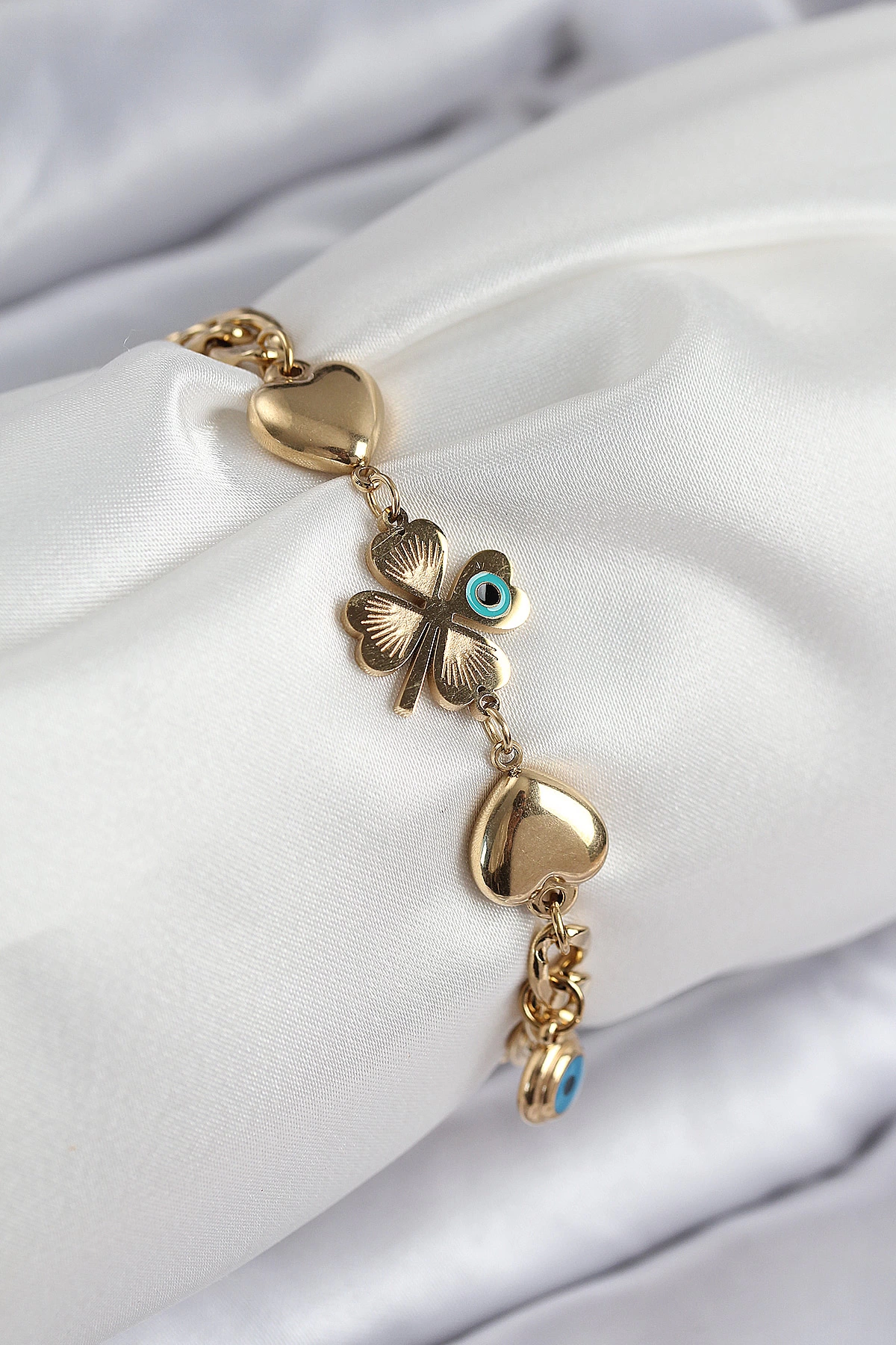 316l Çelik Nazar Boncuk Detaylı Yonca Model Gold Renk Kadın Bileklik