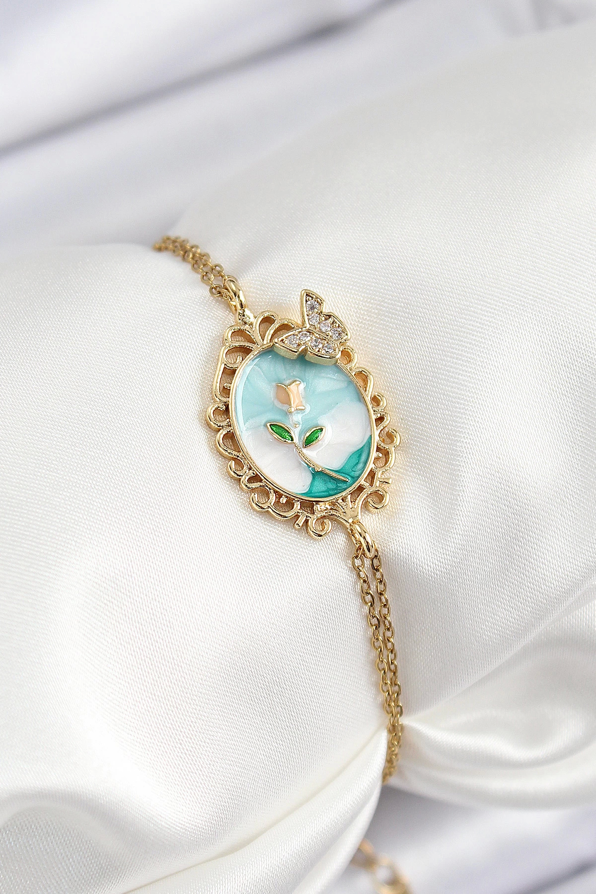 316l Çelik Zincir Mineli Sanatsal Portre Zirkon Taşlı Kelebek Detaylı Çiçek Model Gold Renk Kadın Bileklik
