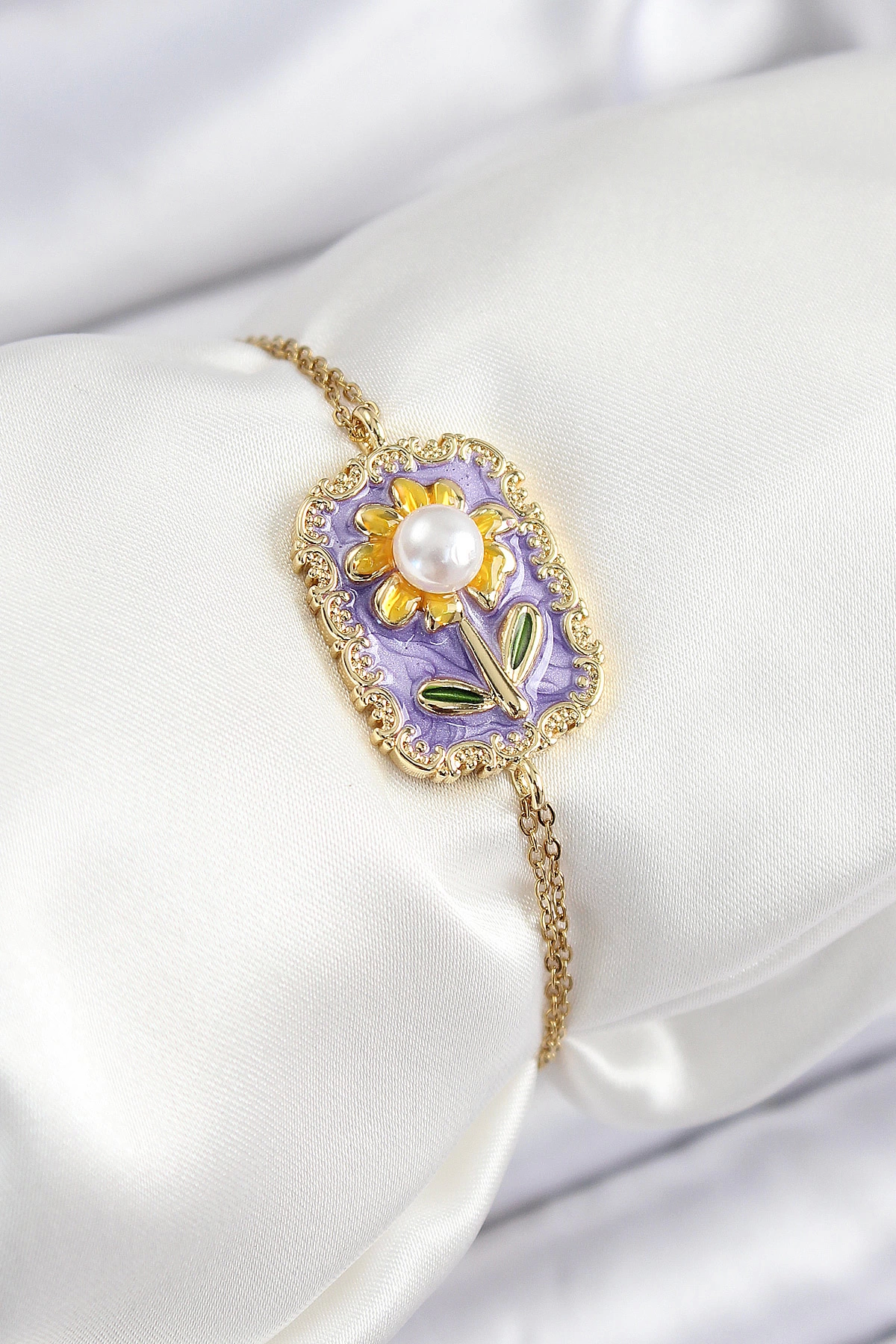316l Çelik Zincir Mor Mineli Sanatsal Portre İnci Detaylı Papatya Model Gold Renk Kadın Bileklik