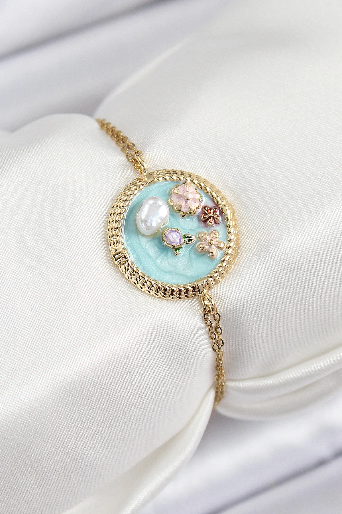 316l Çelik Zincir Turkuaz Mineli Sanatsal Portre İnci Detaylı Çiçek Model Gold Renk Kadın Bileklik
