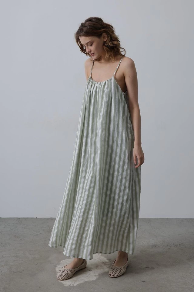 Askılı Çizgi Desen Elbise - Haki
