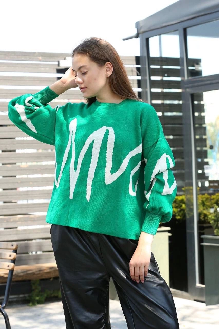Beyaz Çizgili Bisiklet Yaka Kazak Yeşil