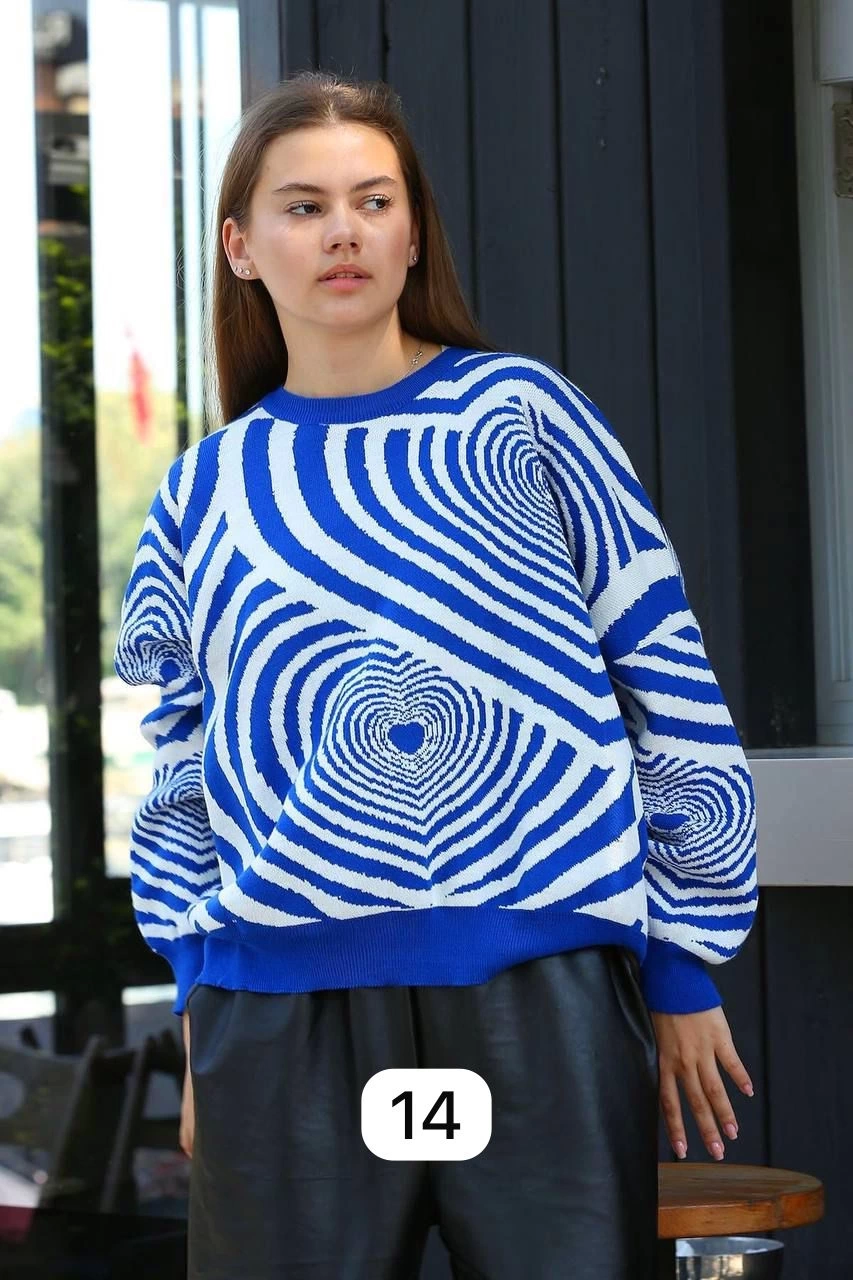 Beyaz Kalp Çizgili Kazak Saks Mavisi