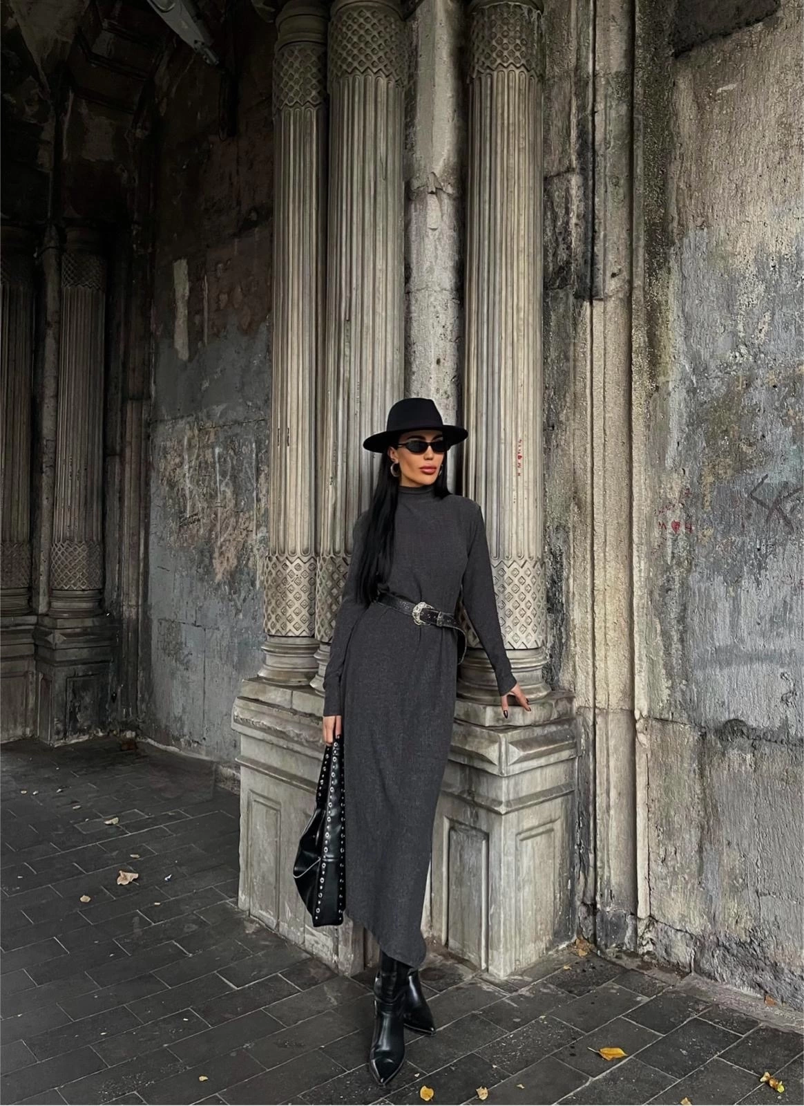 Boğazlı Kalın Bürümcük Uzun Elbise Siyah
