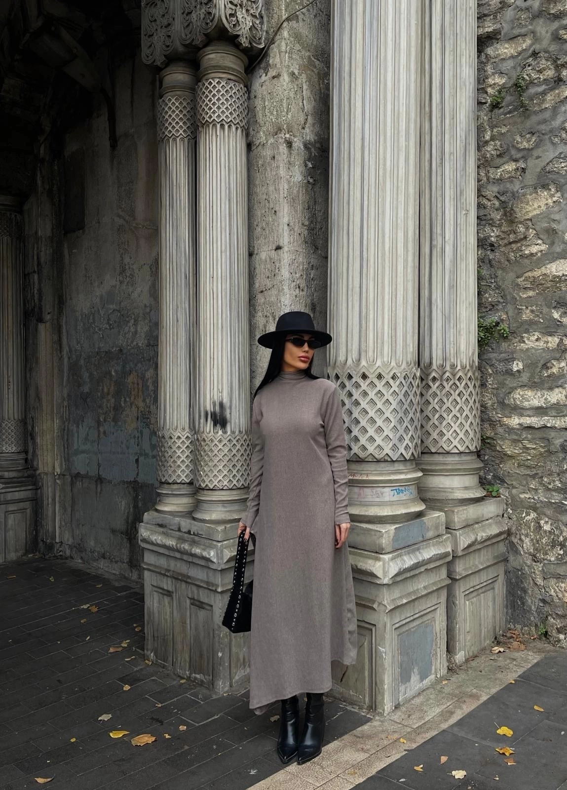 Boğazlı Kalın Bürümcük Uzun Elbise Vizon