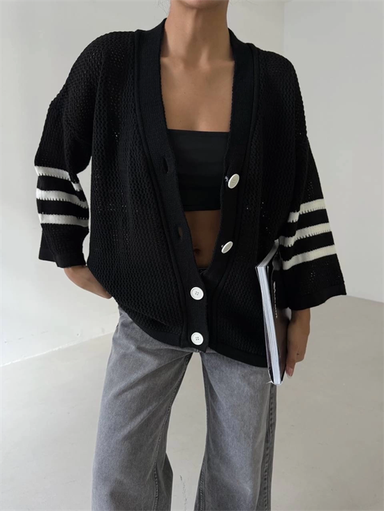 Büyük Düğmeli Salaş Triko Hırka Siyahbeyaz