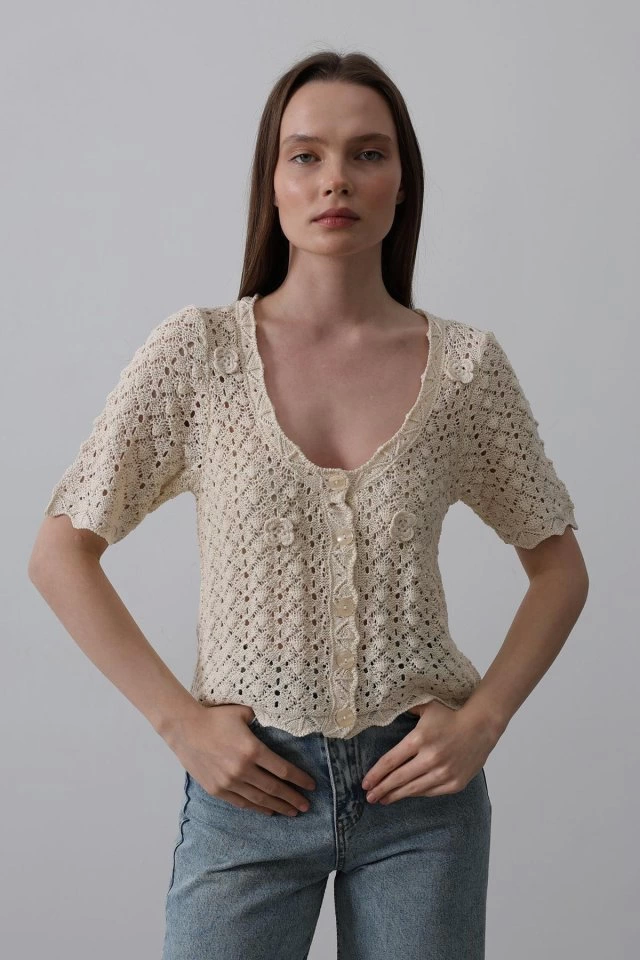 Çiçek Detaylı Düğmeli Triko - Ekru