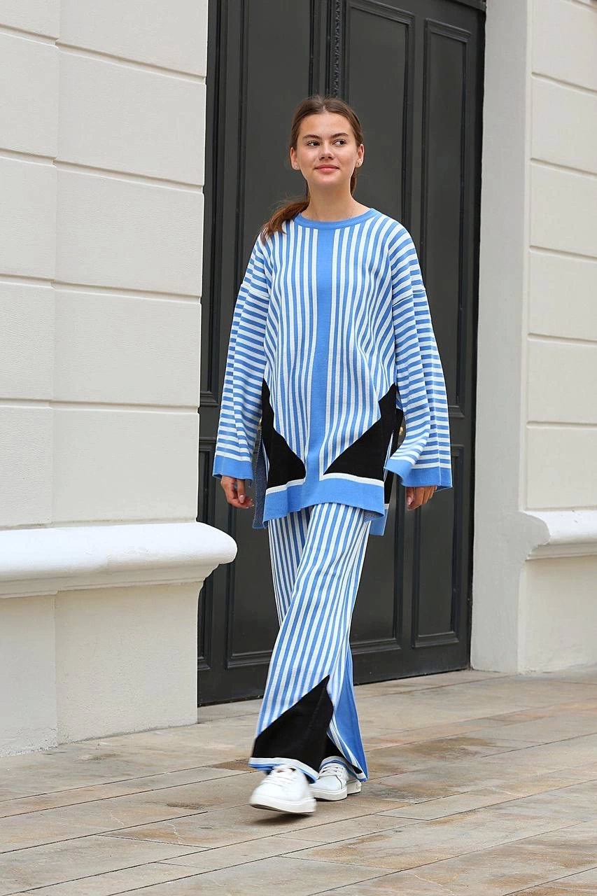Çizgili Bisiklet Yaka Triko Takım Mavi