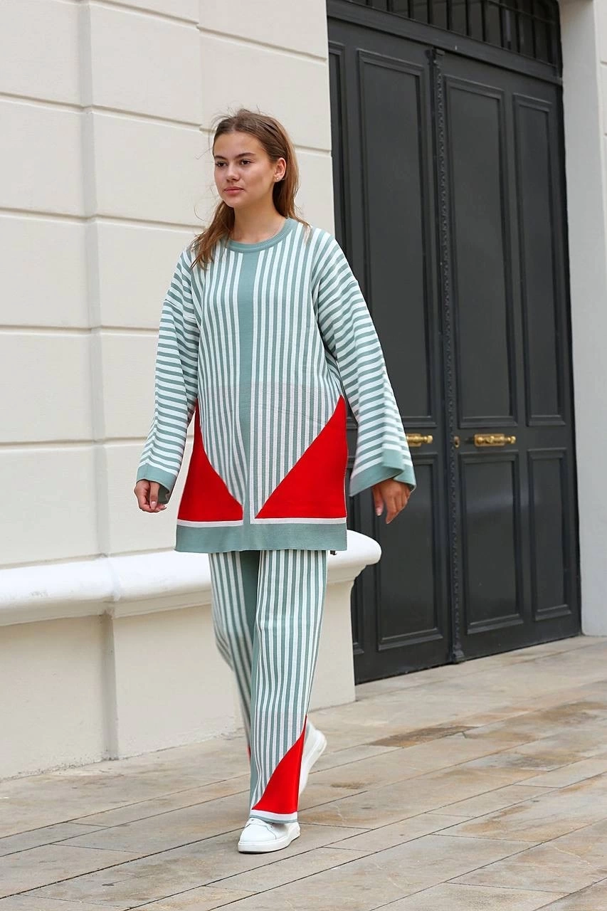 Çizgili Bisiklet Yaka Triko Takım Mint