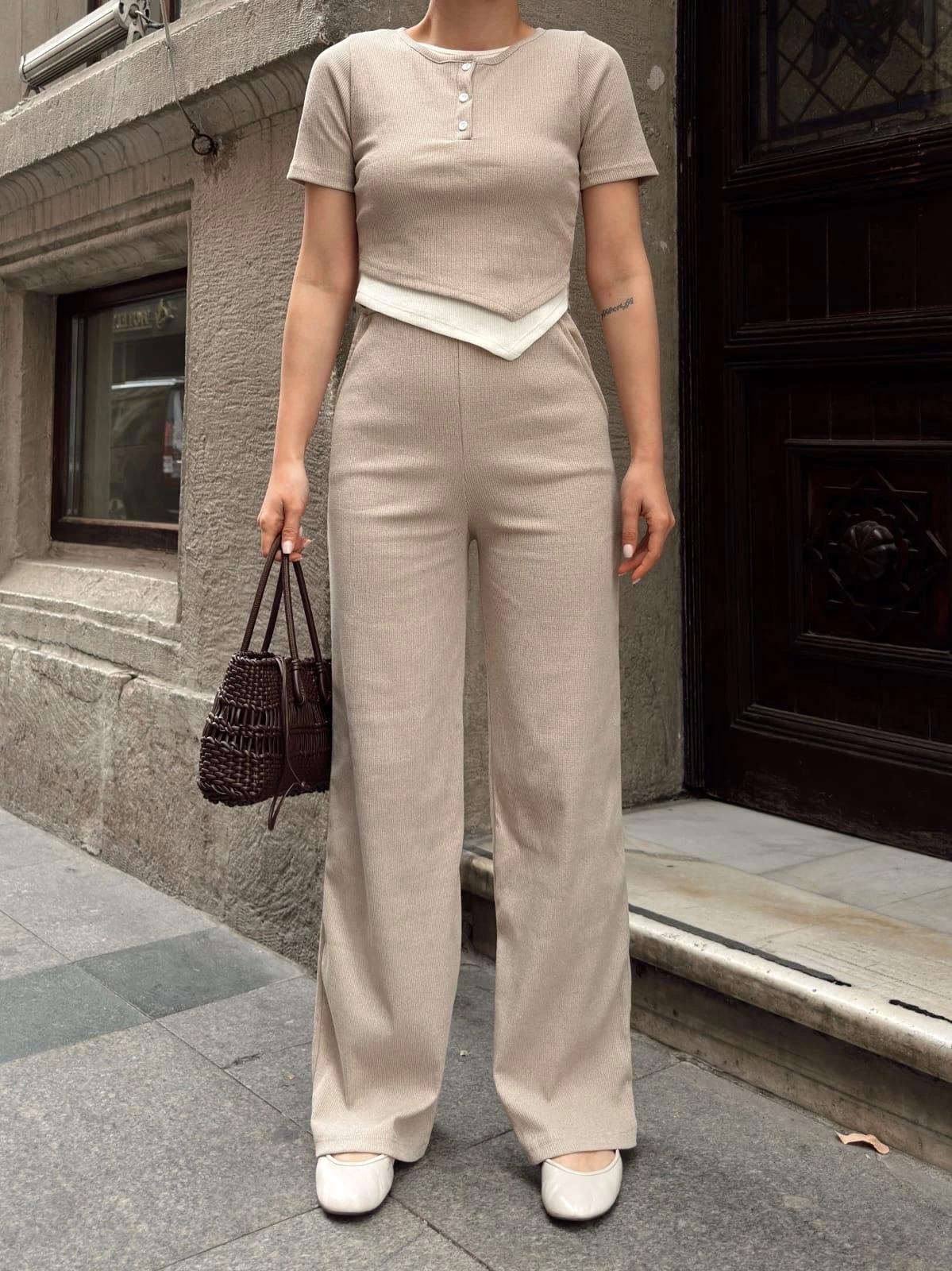 Düğme Yakalı Bej Alt Üst Takım S3943
