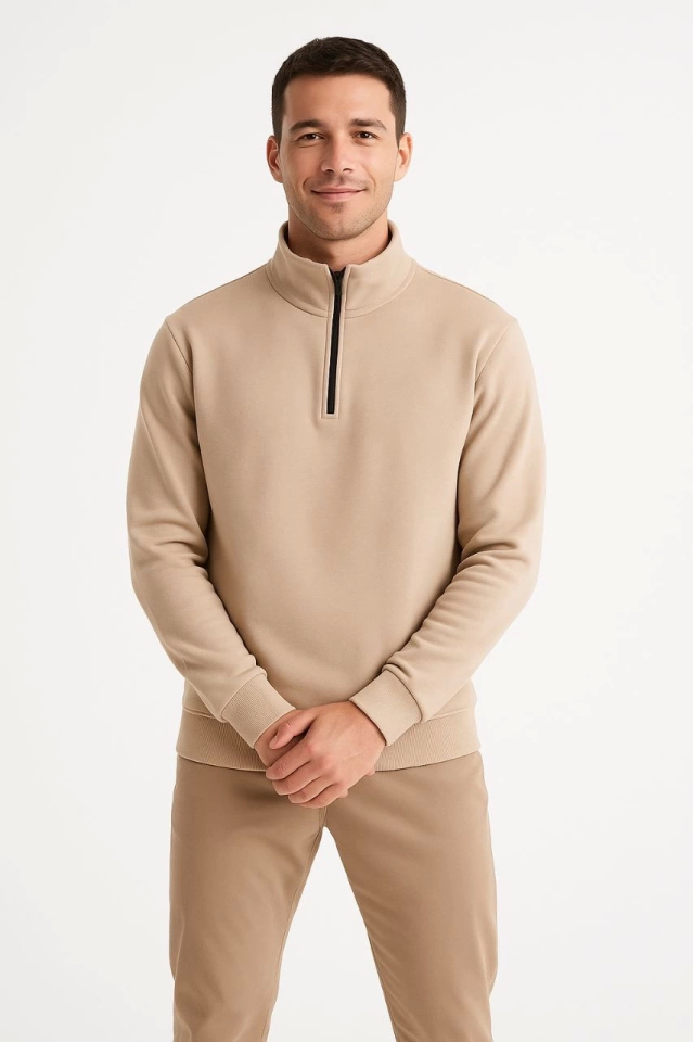 Erkek Dik Yaka Sweatshirt Dik Yaka Yarım Fermuarlı 3 İplik Şardonlu Pamuk Kumaş - Bej