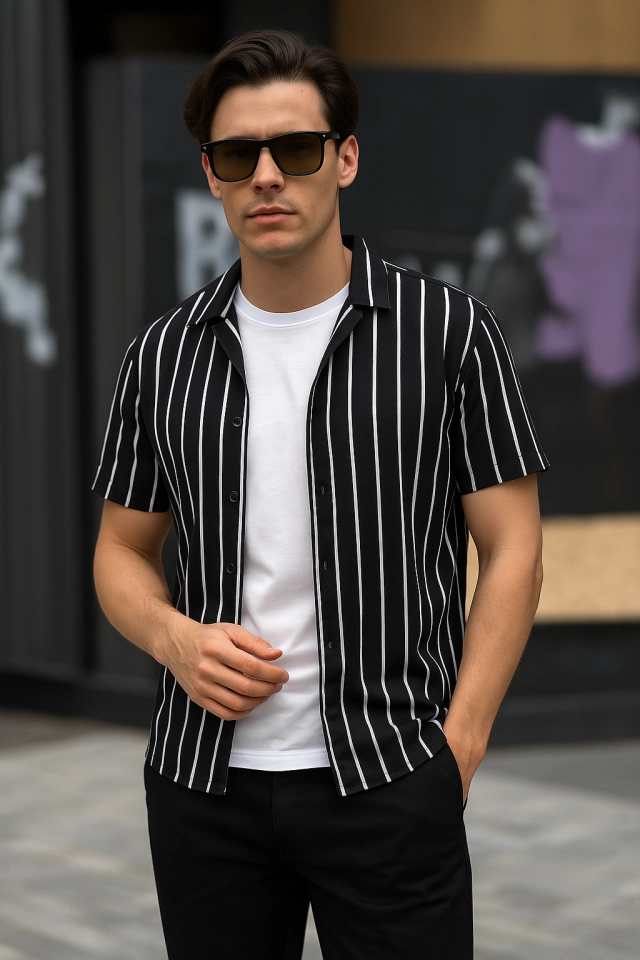 Erkek Kısa Kollu Beyaz çizgi Desenli örme Kumaş Pamuklu Gömlek