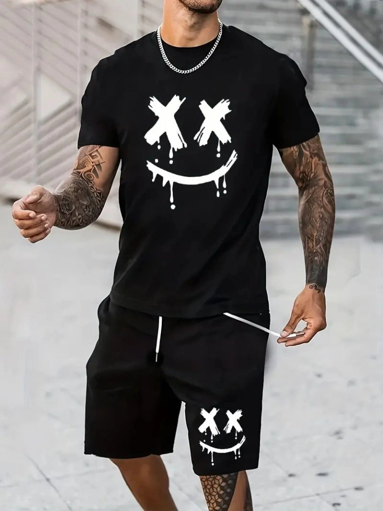 Erkek Kısa Kollu Bisiklet Yaka Baskılı Bluz Ipli Short Iki Iplik Takım