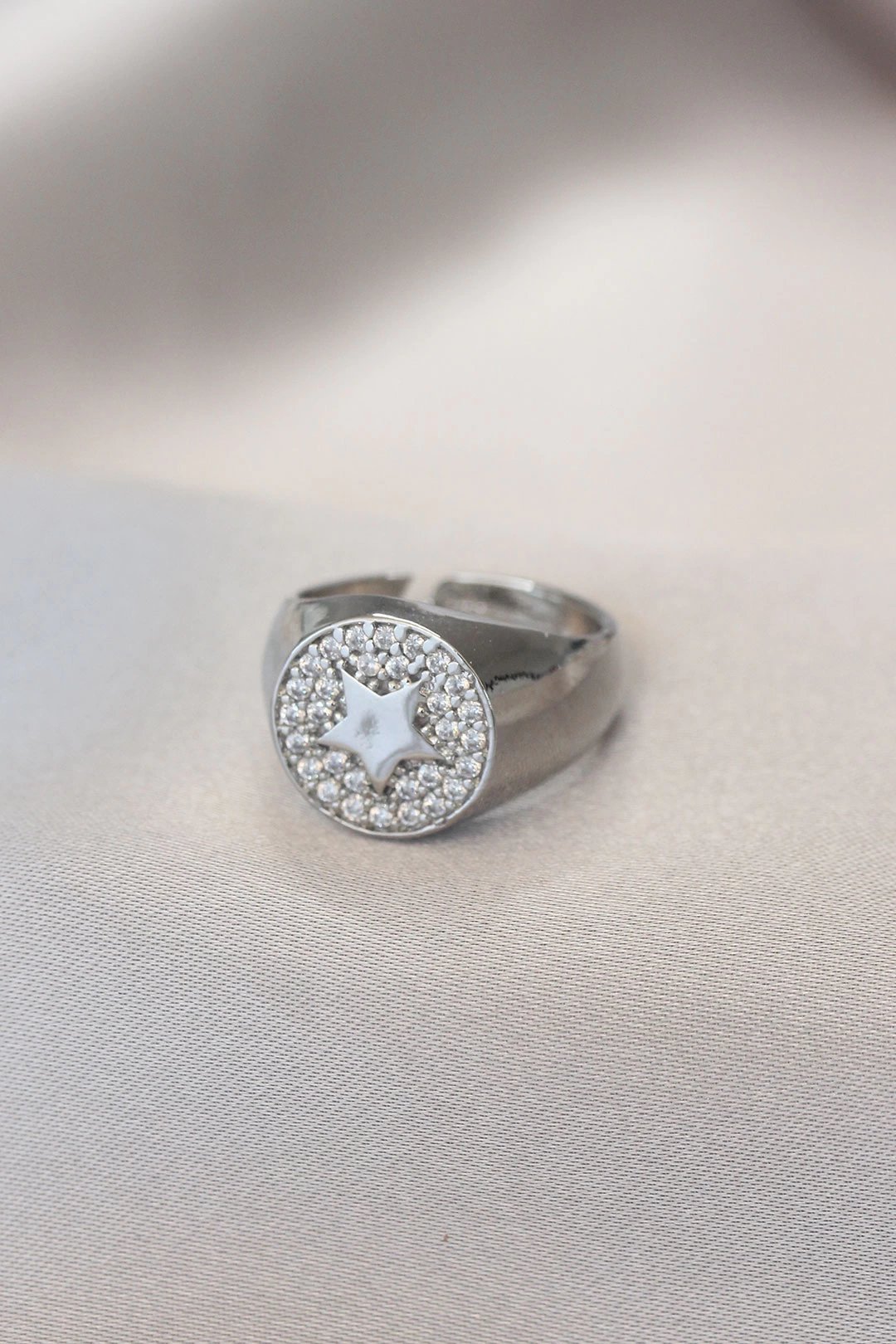 Gümüş Renk Zirkon Taşlı Plaka Yıldız Yüzük