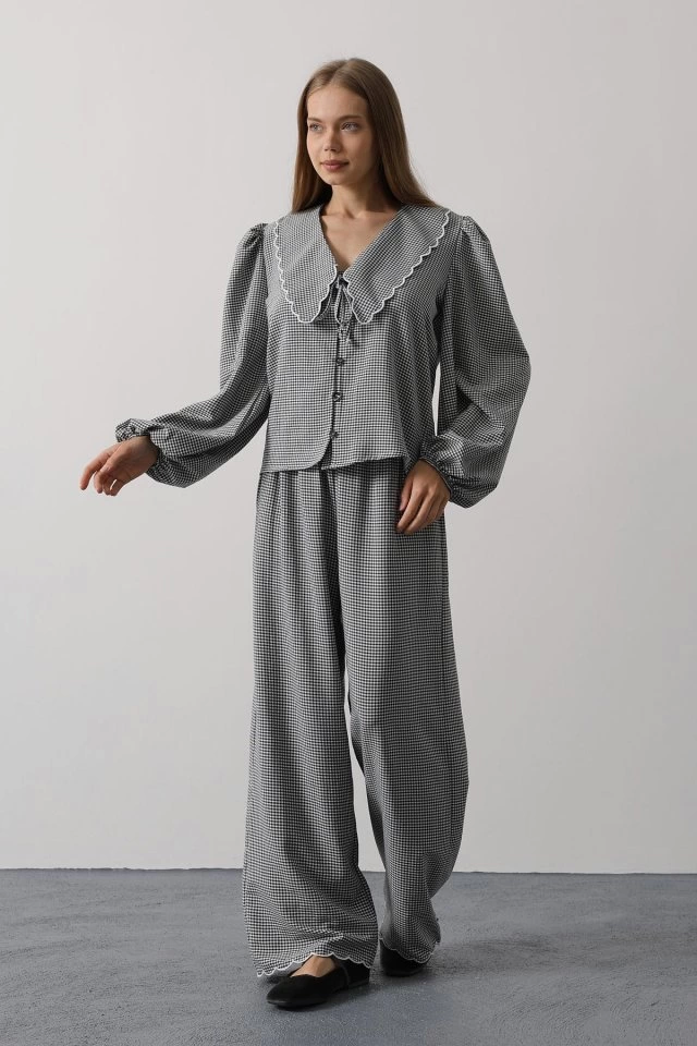 İşlemeli Bebe Yakalı Pantolon Takım - Siyah