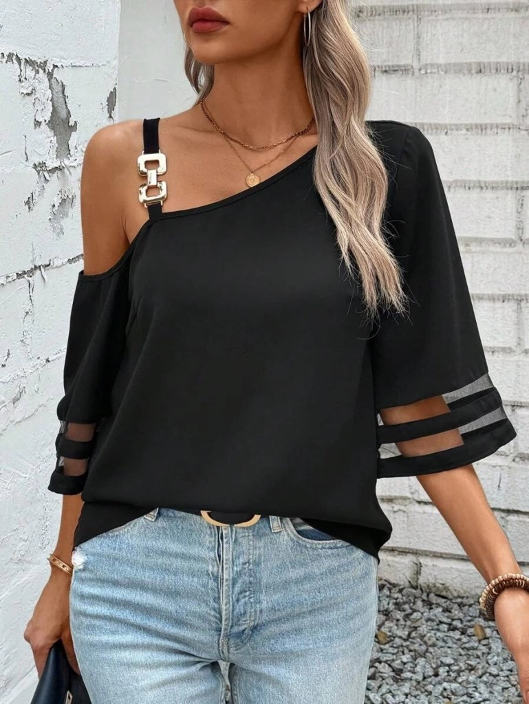 Kadın Askılı Asimetrik Kesim Kol Ve Yaka Kolda Tül Ve Aksesuar Detaylı Janjan Krep Bluz