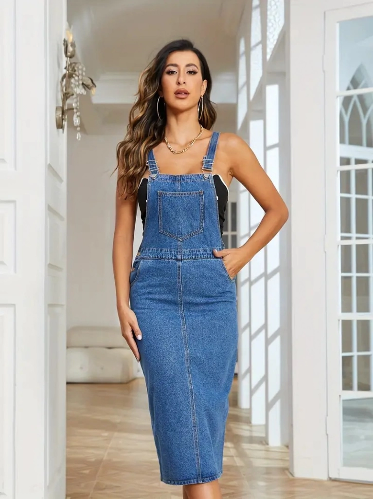 Kadın Askılı önü Cepli Diz Altı Kot Salopet