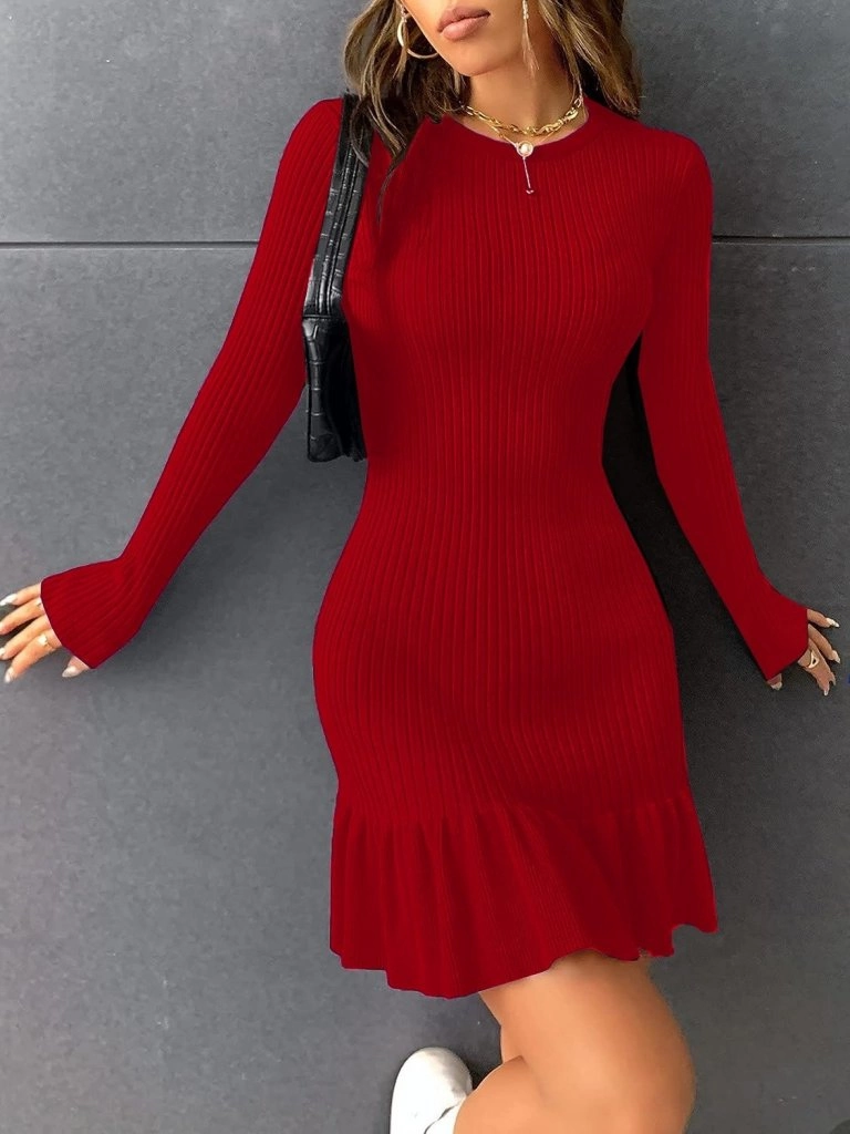 Kadın Bisiklet Yaka Uzun Kol Etek Ucu Fırfırlı Triko (polyenit) Mini Boy Elbise