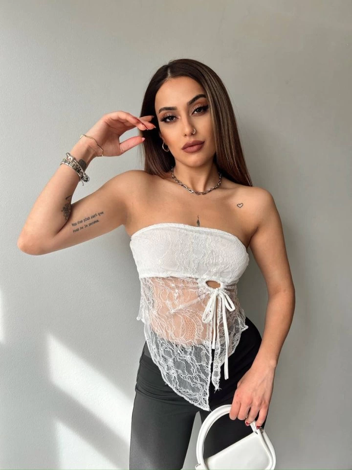 Kadın Göğüs Ve Sırt Dekolteli Transparan Dantel Detay Bluz