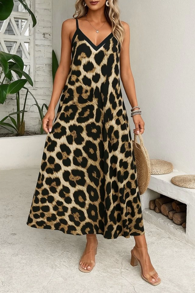 Kadın Ip Askılı Geniş V Yakalı Leopar Desenli Süprem Elbise