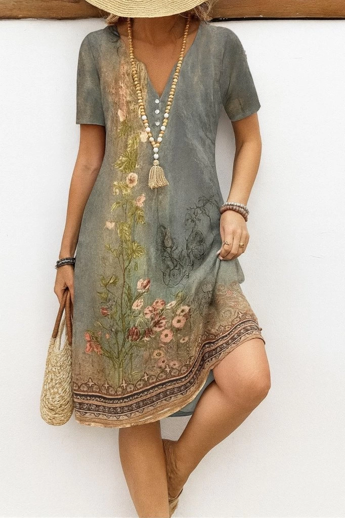 Kadın Kısa Kollu V Yakalı Desenli Süprem Elbise