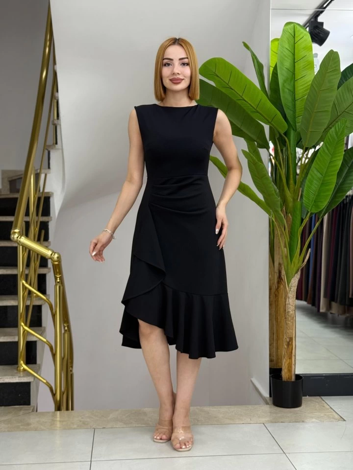Kadın Sıfır Kollu Belden Büzgülü Eteği Volanlı Asimetrik Kesim Midi Janjan Krep Elbise