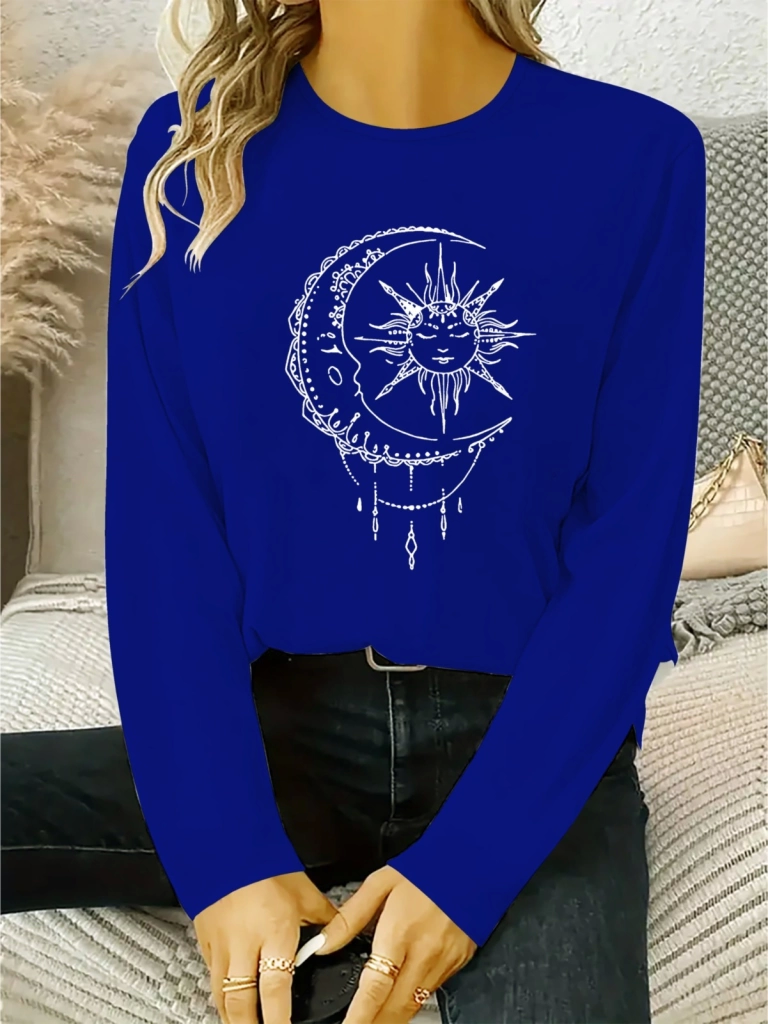 Kadın Uzun Kollu Bisiklet Yaka Ay Baskılı Viskon Bluz