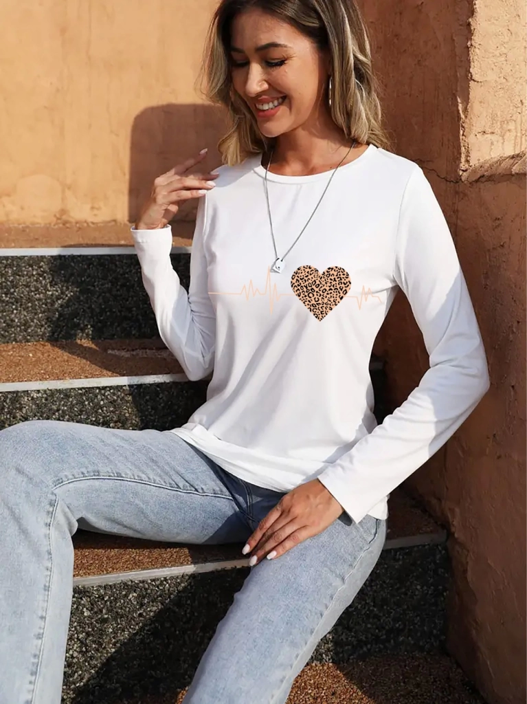 Kadın Uzun Kollu Bisiklet Yaka Kalp Desenli Bluz