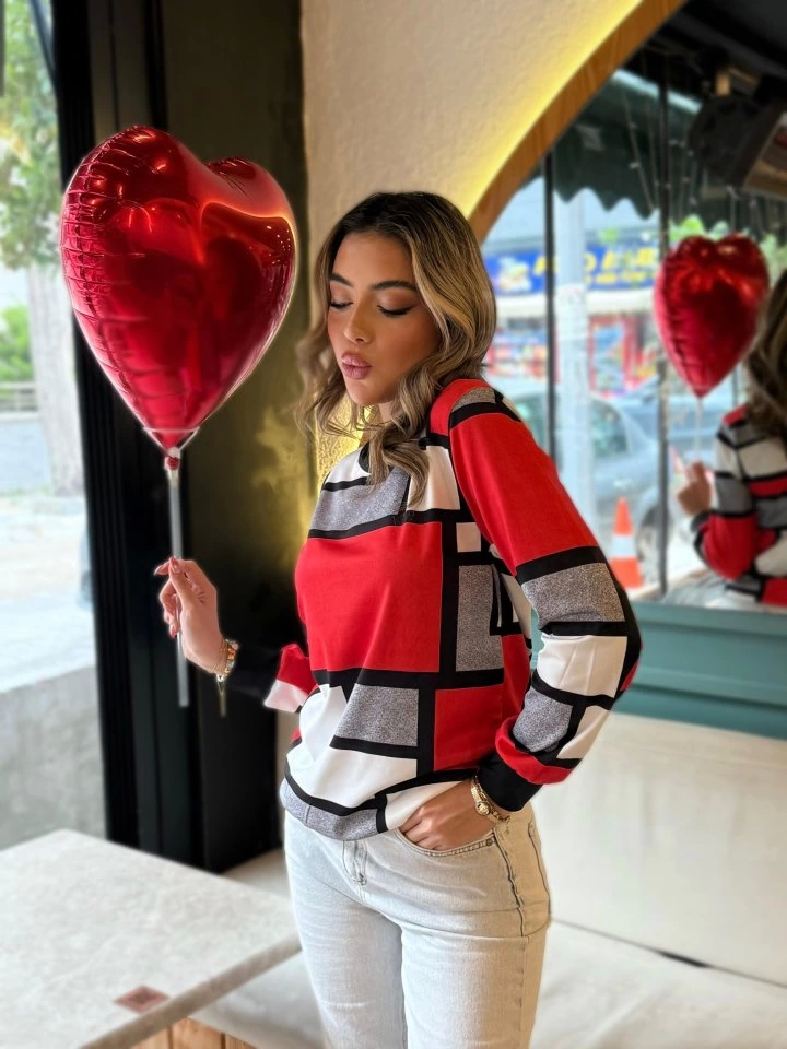 Kadın Uzun Kollu Bisiklet Yaka Renkli Blok Baskı Dalgıç Bluz