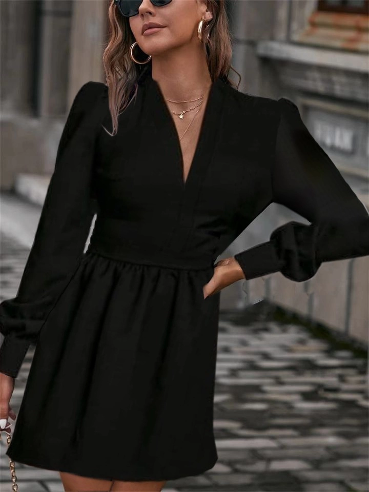 Kadın Uzun Kollu V Yaka Belden Hafif Pileli Scuba Krep Mini Boy Elbise