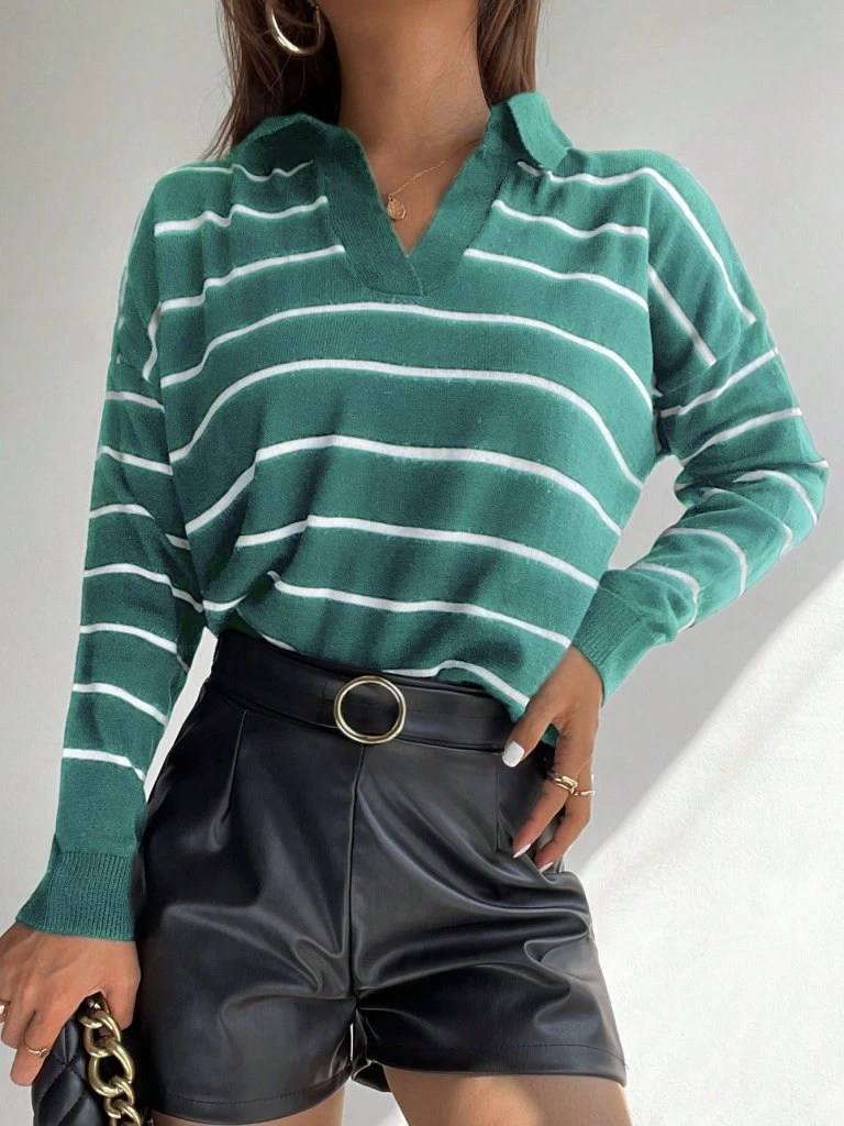 Kadın Uzun Kollu V Yaka Çizgili Triko Bluz