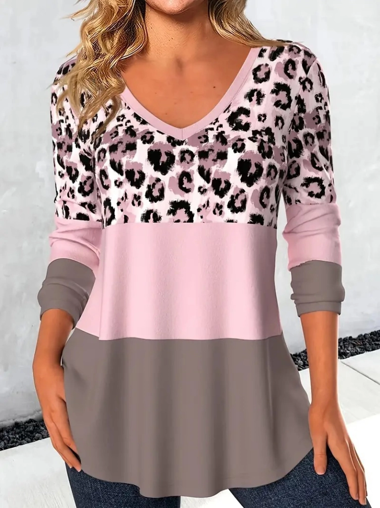 Kadın Uzun Kollu V Yakalı Leopar Baskılı şardonlu Dalgıç Bluz