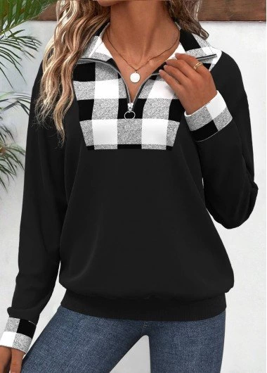 Kadın Uzun Kollu Yakalı önden Fermuarlı Ekose Detaylı Viskon Iki Iplik Bluz