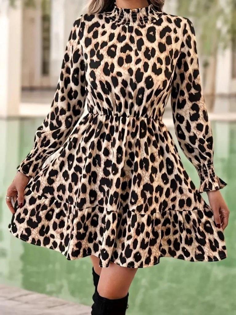 Kadın Uzun Kollu Yarı Balıkçı Yaka Leopar Desenli Modal Mini Elbise
