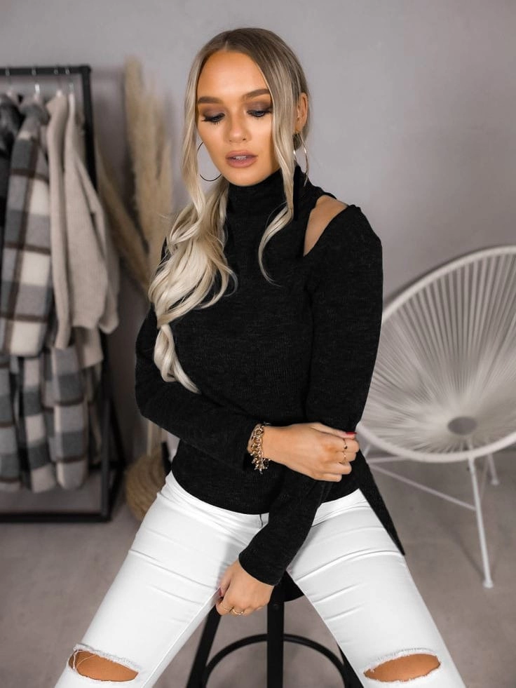 Kadın Uzun Kollu Yarım Balıkçı Yaka Omuzları Açık Bir Tarafı Yırtmaçlı Yumoş Bluz