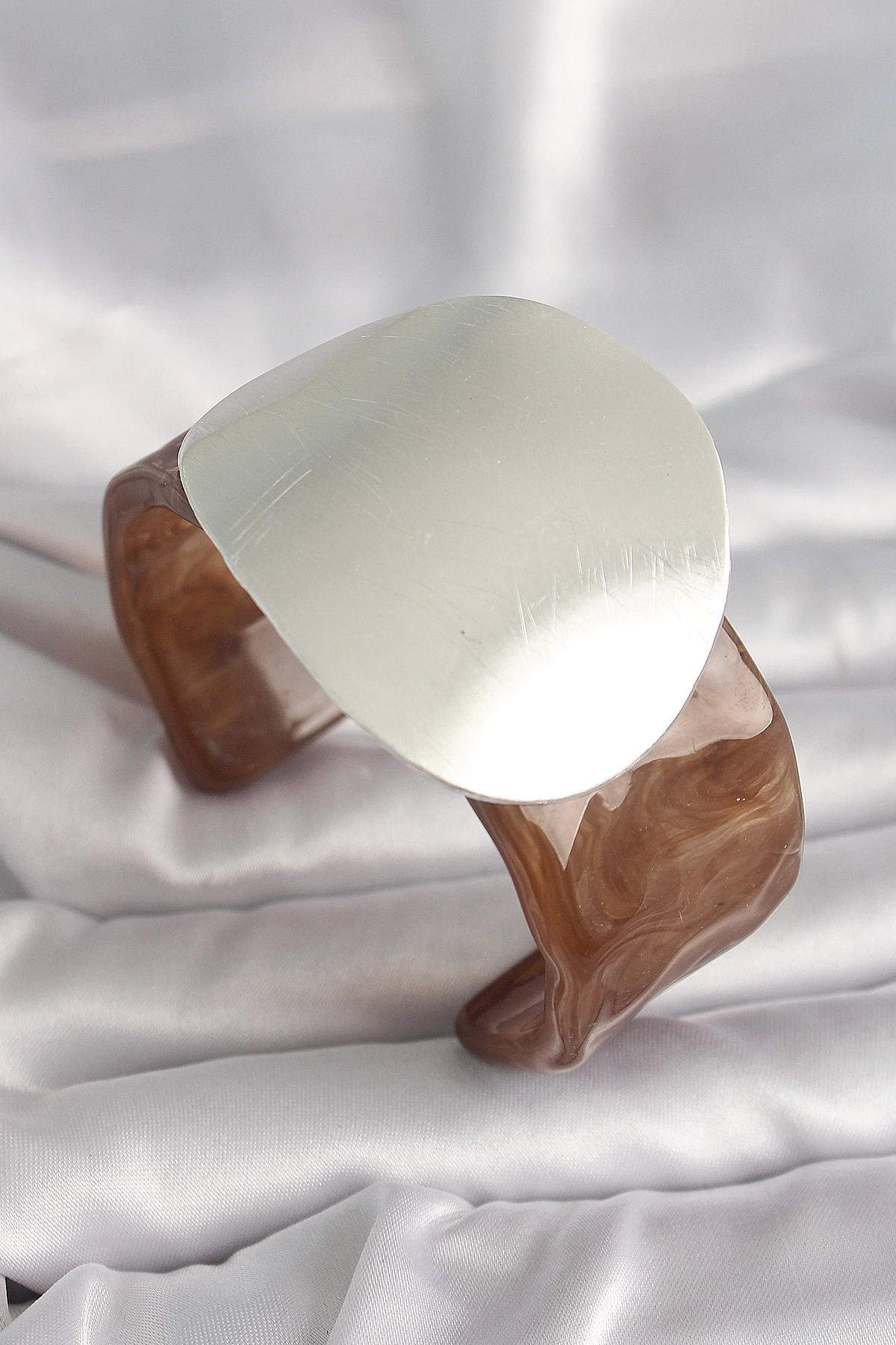 Kahverengi Mermer Desen Akrilik Plastik Gümüş Plaka Model Vintage Kadın Bilezik