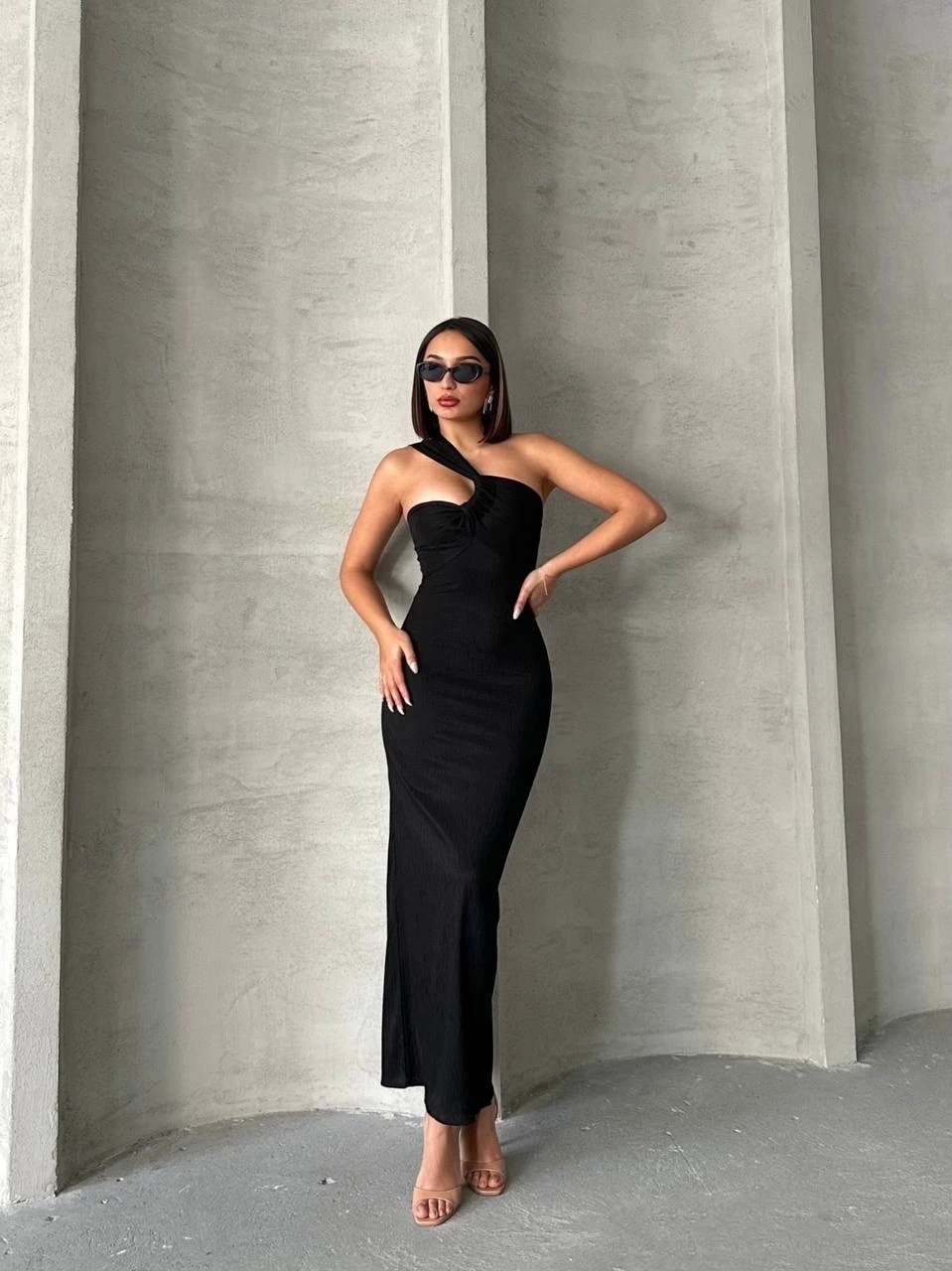 Krinkıl Tek Omuz Uzun Elbise Siyah S25455